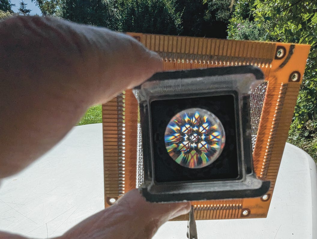 Das Foto zeigt Ringkernspeicher eines Univac-Großcomputers von 1961. Jeder einzelne dieser ca. 0,4 mm kleinen Magnetringe speicherte genau 1 Bit, 0 oder 1. Die gesamte Schaltung hier speicherte also gerade mal 1024 Bit. Das Bild steht damit symbolisch für die Leistungssteigerung der Computer, durch die u.a. Wetter- und Klimasimulationen möglich wurden. Sie sind Teile von Umwelt- und Naturschutz (Foto: Rolf Kickuth).