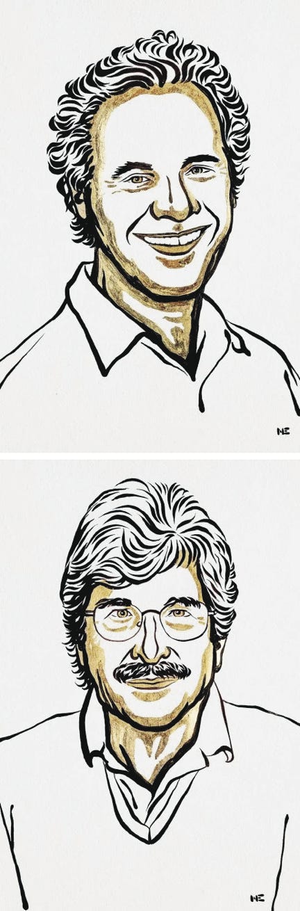 Victor Ambros (oben) und Gary Ruvkun teilen sich den Physiologie-Medizin-Nobelpreis je zur Hälfte (Abb.: Ill. Niklas Elmehed / Nobel Prize Outreach).