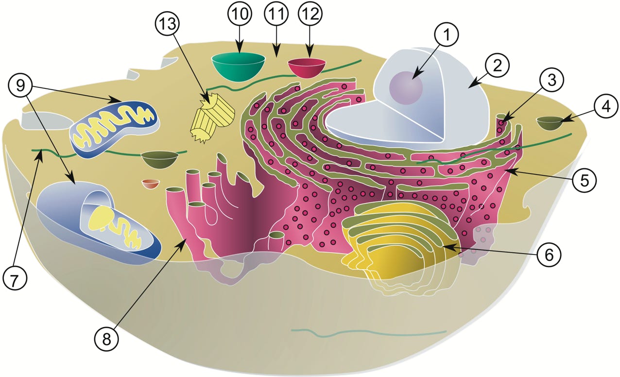 Organisation einer typischen eukaryotischen Tierzelle (Abb.: Wikipedia / MesserWoland und Szczepan1990 CC BY-SA 3.0)