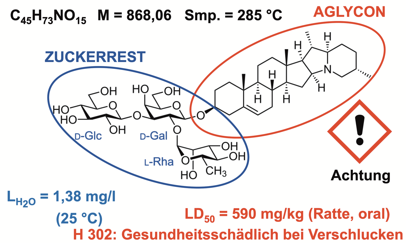 Beispiel eines Saponins, das giftige α-Solanin aus grünen Tomaten und Kartoffeln, bestehend aus einem Steroidalkaloid als unlösliches Aglycon und wasserlöslichem Zuckerrest.
