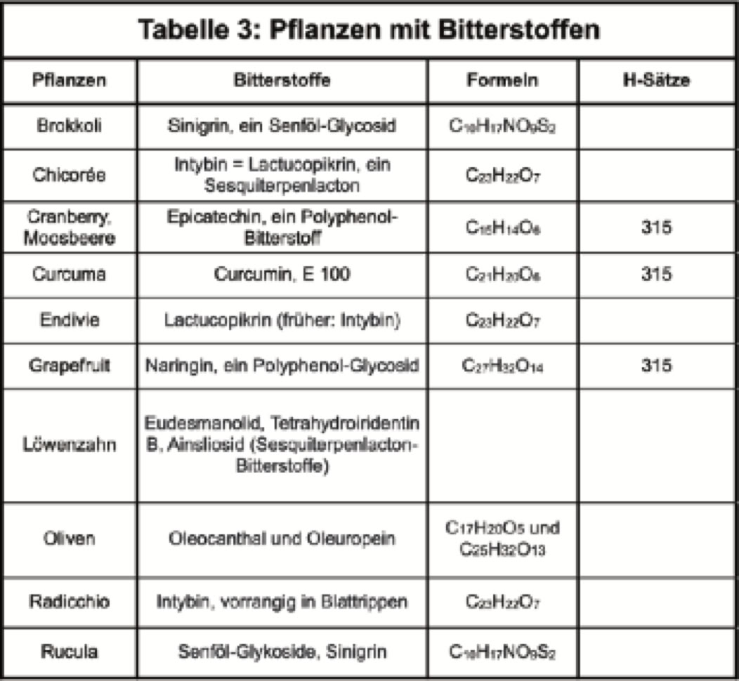 Bitterstoffe steigern reflektorisch die Magen- und Gallensaft-Sekretion. Sie wirken daher appetitanregend und fördern die Verdauung. Viele Bitterstoffe sind allerdings giftig. Aus den meisten Nahrungsmittel-Pflanzen ließen sie sich über Züchtungen mindern oder ganz eliminieren, so dass sie überhaupt zu genießen sind [1].