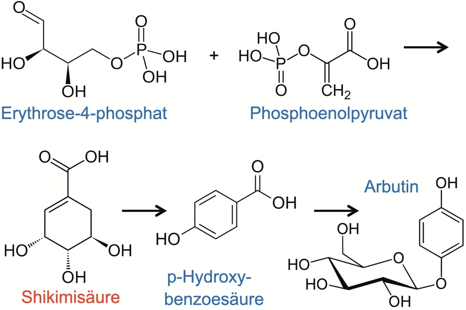 Biosynthese des Arbutins über den „Shikimatweg“ (verkürzt).