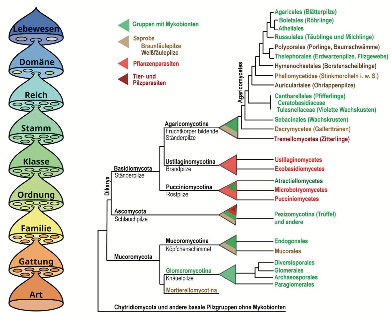 Klassifizierungskategorien zur Einteilung von Lebewesen und systematische Einteilung des Reichs der Pilze (mehrere kleine Gruppen wurden weggelassen) (Abb.: Wikipedia / Ingrid Kottke CC BY-SA 4.0.