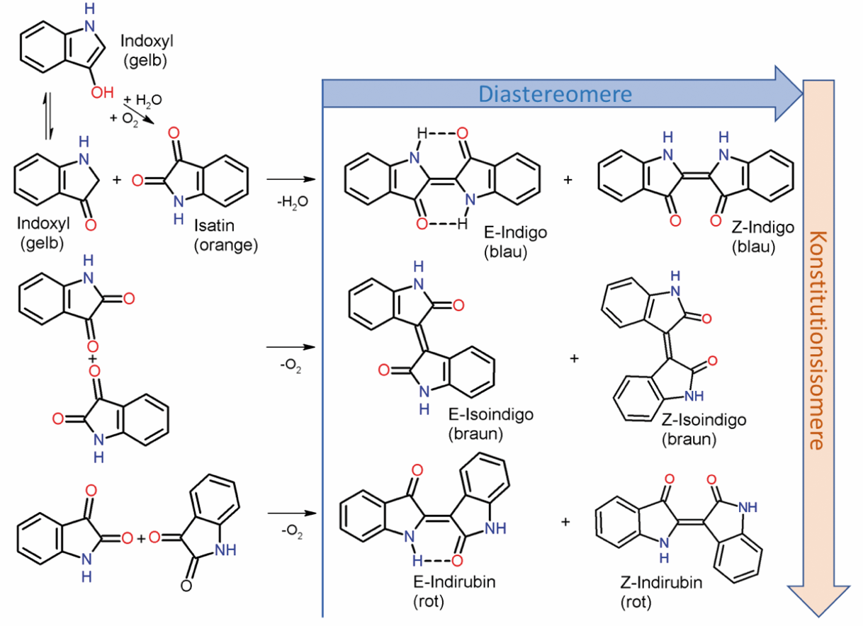 Bildung der indigoiden Substanzen Indigo, Isoindigo und Indirubin aus den Vorläufersubstanzen Indoxyl und Isatin. Die Anteile der drei Reaktionsprodukte variieren, je nach Reaktions-Bedingungen. Die indigoiden Verbindungen (Indigo, Isoindigo und Indirubin) haben alle diesel- be Summenformel und ganz ähnliche physikalische und chemische Eigenschaften.