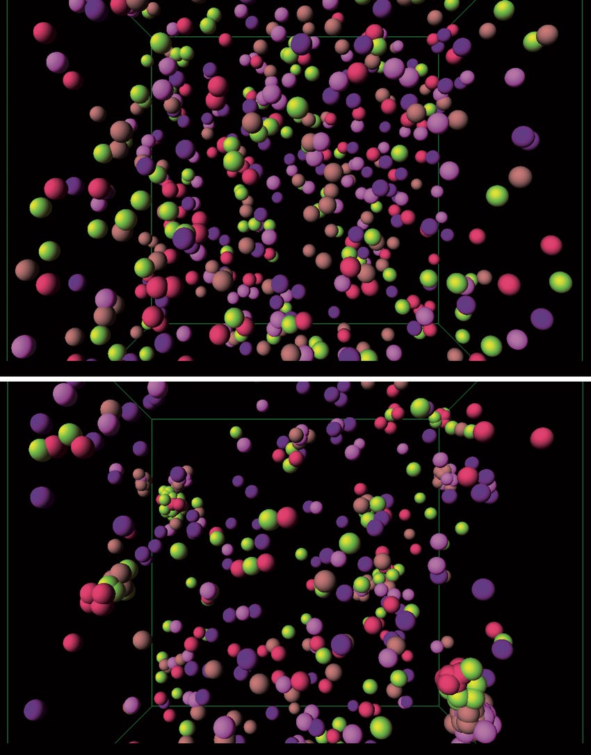 Was zu Anfang ein buntes, zusammengewürfeltes Gemisch kleiner und größerer Kügelchen ist, wird mit ein paar Beziehungsregeln nach einem be- stimmten Zeitablauf zu selbstorganisierten Haufen (Abb.: Kickuth).