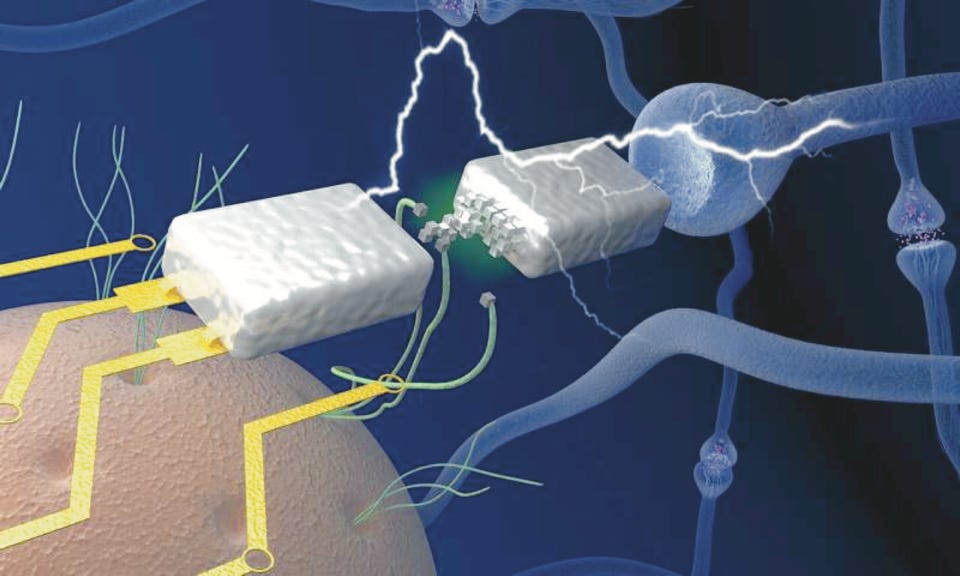 Von Mikroben geobacter (orange) geerntete Protein-Nanodrähte (grün) ermöglichen es dem elektronischen Memristor (silbern), mit biologischen Spannungen zu arbeiten und die neuronalen Komponenten (blaue Übergänge) in einem Gehirn zu emulieren (Abb.: UMass Amherst / Yao Labors).