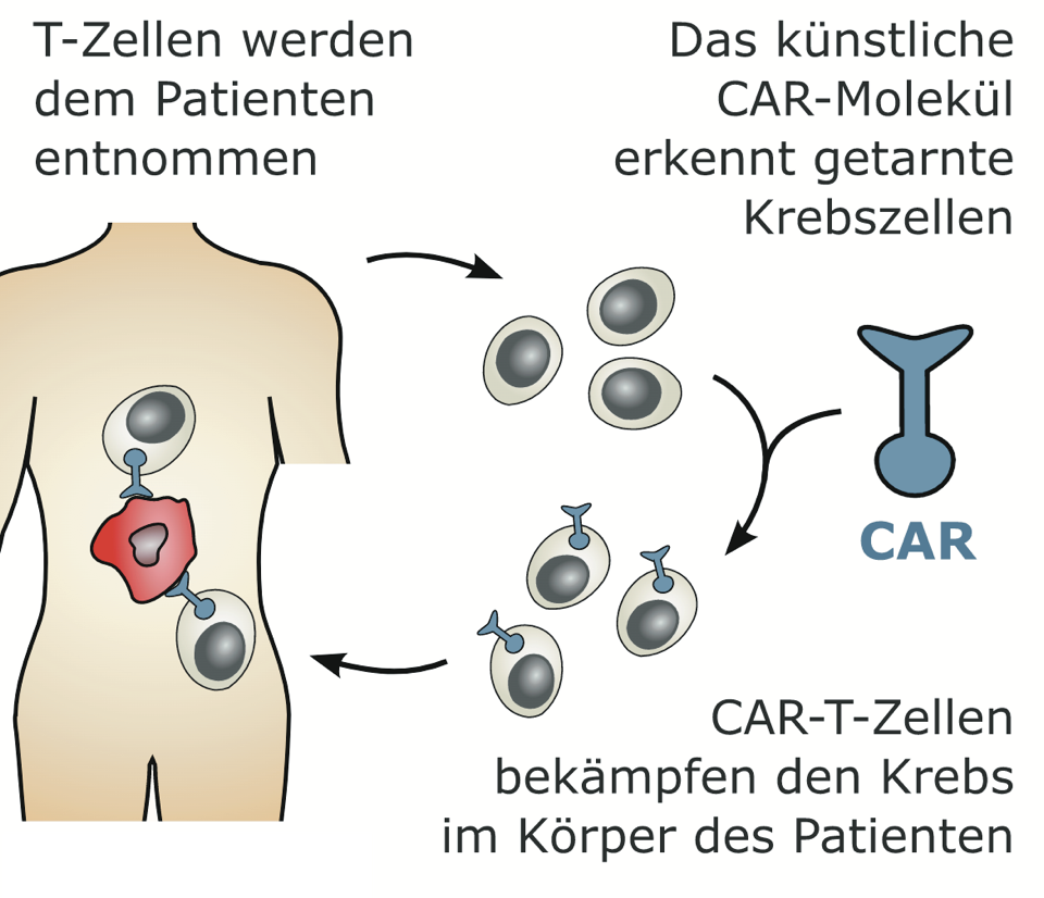 Prinzip einer Therapie mit CAR-T-Zellen: Das künstliche CAR-Molekül hilft den Immunzellen, getarnte Krebszellen aufzuspüren und zu beseitigen (wissenschau.de).