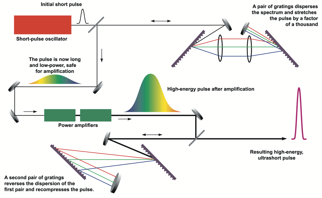 Unten: Prinzip der Chirped Pulse Amplification (CPA): Anstatt einen Lichtimpuls direkt zu verstärken, wird er durch ein Paar optischer Gitter mit positiver Dispersion zunächst zeitlich gedehnt, wodurch seine Spitzenleistung verringert wird. Dann wird der Impuls verstärkt und anschließend wieder komprimiert, durch ein zweites Paar optischer Gitter mit umgekehrter Dispersion; mit mit zueinander verkippten Gittern und man erhält eine negative Dispersion, mit parallel zueinander stehenden eine positive. Auf diese Weise wird der Lichtimpuls extrem intensiv (Abbildung: US-Energieministerium).