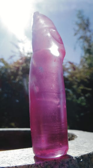 Links: Dies als Symbol eines Peniskults zu sehen wäre eine Fehlinterpretation ;-) Es ist ein ziemlich unregelmäßig gezüchteter Rubin-Einkristall (Foto: RK).