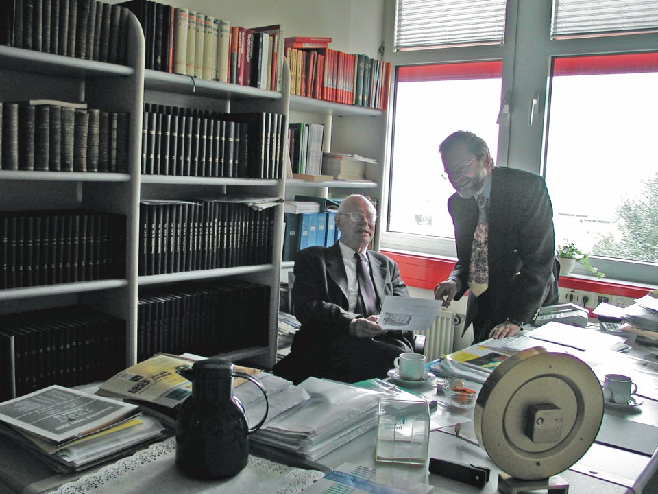 Unten: Alles bekommt mehr Farbe, nicht nur die Kravatte: Der fast 88jährige Gründungsherausgeber Wilhelm Fresenius mit dem Entwurf der CLB aus dem Rubikon-Verlag. Im Gespräch mit ihm hatte ich dargelegt, der Zeitschrift durch konsequenten Vierfarbdruck mehr Gestaltungsmöglichkeiten zu geben und auch den Charakter einer allgemeinverständlichen Wissenschaftspublikation zu stärken. Im Jahr 2001 war das noch eher ungewöhnlich. Allerdings kam mir entgegen, dass der Umschau-Verlag trotz eigener Druckerei einen für die CLB besonders geeigneten Druckbetrieb gefunden hatte: Printec Offset in Kassel. Geschäftsführer Michael Faste und seine Frau Angela sowie die Mitarbeiter unterstützen uns bis heute bei allen Aufgaben von Druck und Vertrieb (Foto: CLB-Archiv).