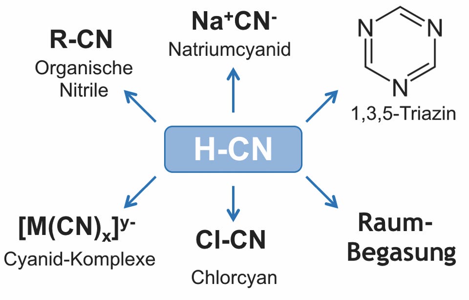Industrieller Einsatz von Cyanwasserstoff, HCN.