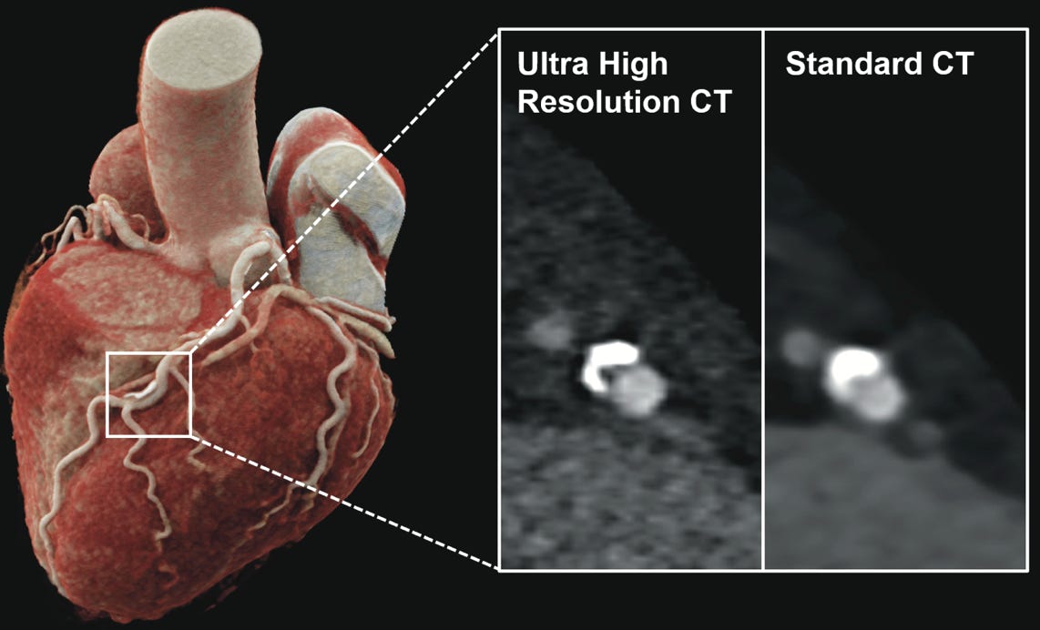 3D-Rekonstruktionen einer Computertomographie des Herzens mit Verkalkungen der linken Herzkranzarterie. Die innovative Photon-Counting-Detektor CT ermöglicht eine höhere räumliche Auflösung (UHR, li.) im Vergleich zur herkömmlichen CT (Standard, re; Abb.: UM / Tilman Emrich)