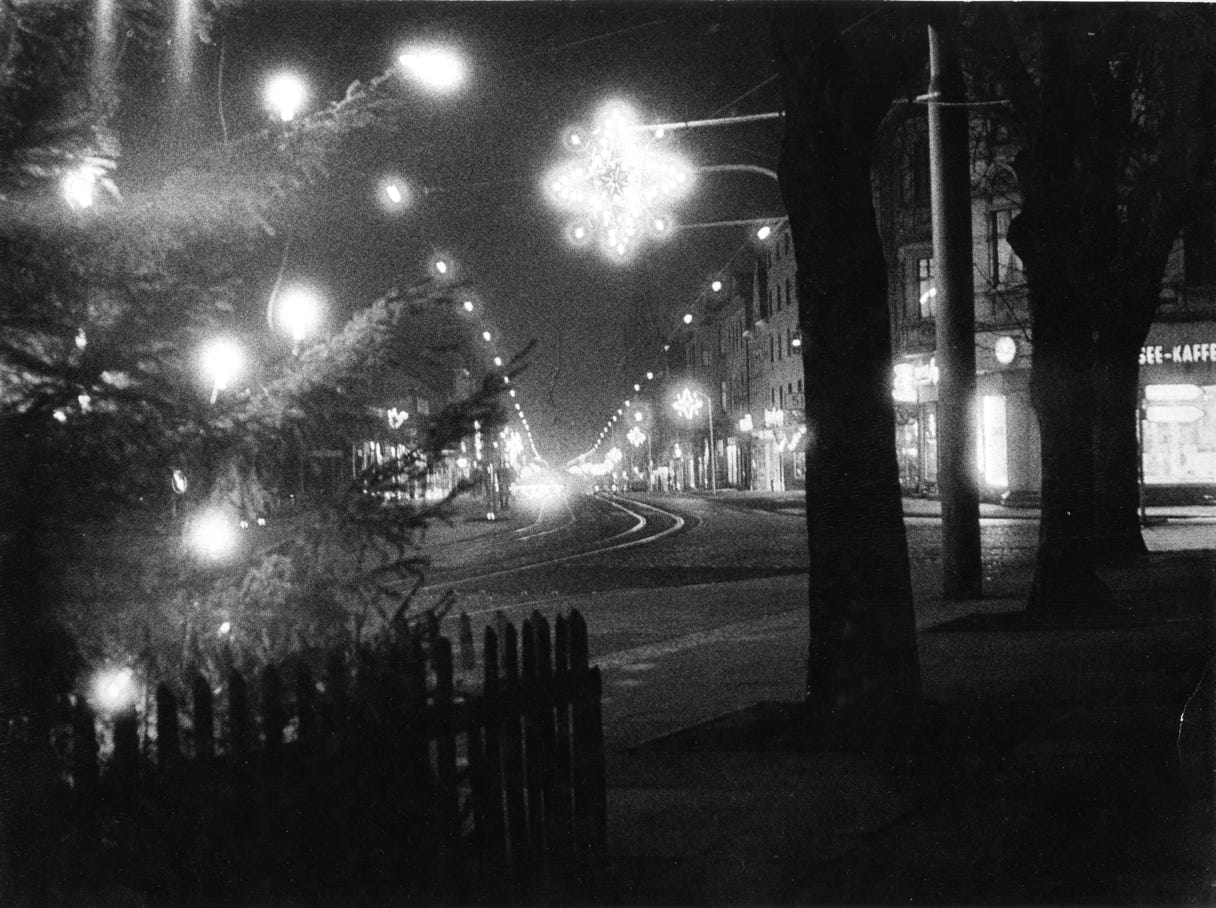 Diese Nachtaufnahme vom weihnachtlichen Herne des Jahres 1969 zeigt Lichthöfe durch chemische Diffusion im Film insbesondere bei den nahen Baumkerzen links wie auch kreisförmige Reflexionslichthöfe um die Lichter des Sternbeleuchtung oben Mitte herum (Foto.: Rolf Kickuth).