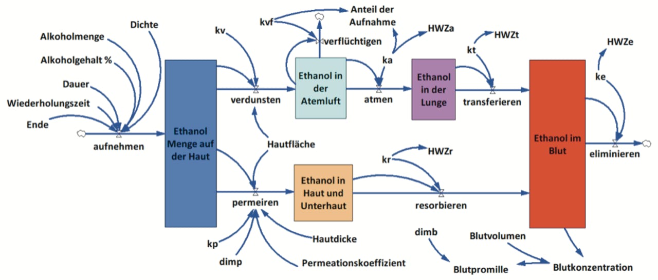 Das Simulationsdiagramm zeigt die Aufnahme von Ethanol (Alkohol) bei 20-facher Desinfektion der Hände mit je 4 ml innerhalb von 30 Minuten. Die Aufnahme erfolgt als Flüssigkeit dermal und als Ethanol Dampf inhalativ. (Die Dokumentation ist auf Anfrage erhältlich).