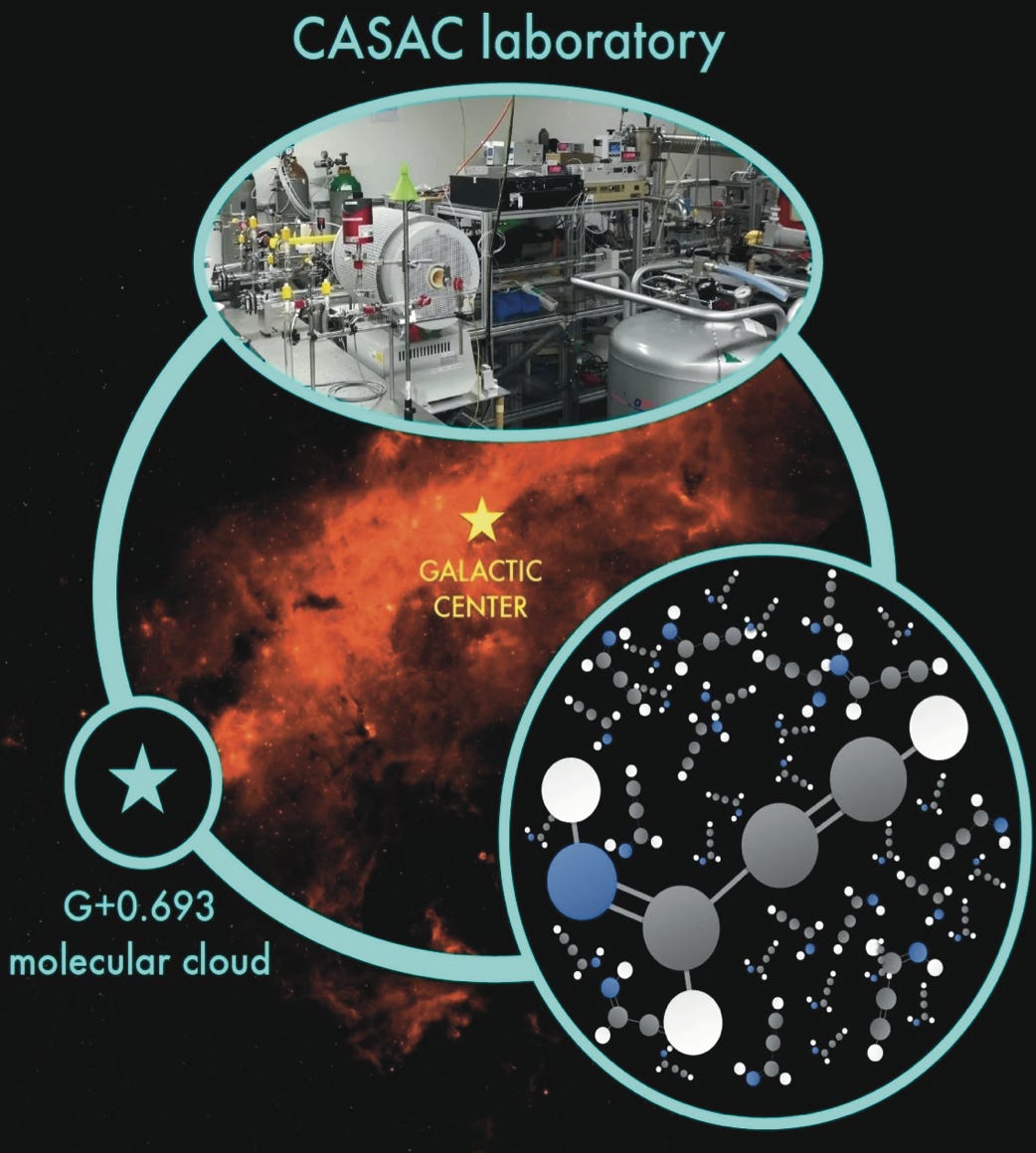 Das Hintergrundbild zeigt das galaktische Zentrum, wie es von der IRAC-Kamera (Infrared Array Camera) des Weltraumteleskops Spitzer (NASA) beobachtet wird. Der gelbe Stern zeigt die Position des galaktischen Zentrums, und der türkise Stern zeigt die Position der Molekülwolke G+0.693-0.027. In dieser Region wurde das Molekül Propargylimin (rechts unten) zum ersten Mal nachgewiesen. Es wurde im spektroskopischen Labor CASAC des Max-Planck-Instituts für Extraterrestrische Physik charakterisiert (oben; Abbildung: NASA Spitzer Space Telescope, IRAC4 camera (8 microns), MPE-CASAC experiment, Víctor M. Rivilla (INAF-Arcetri))