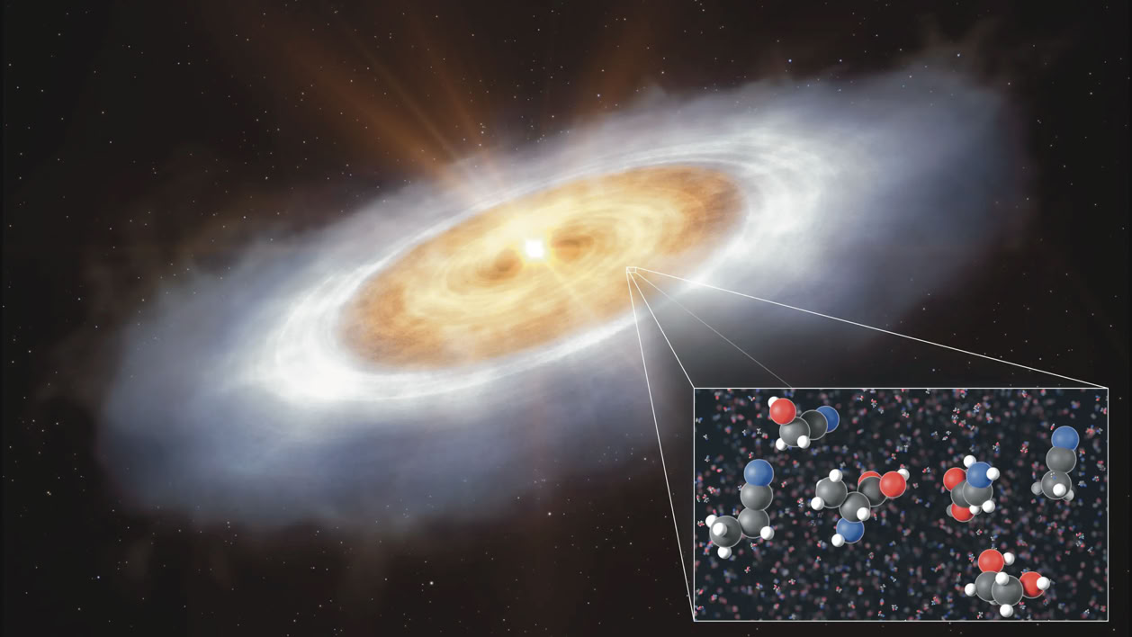 Abbildung 1: Seit neuestem gibt es erste Hinweise auf präbiotische Moleküle in einer planetenbildenden Scheibe: Im jungen Sternsystem V883 Orionis konnten mit ALMA erste Hinweise auf komplexe organische Verbindungen wie Ethylenglykol und Glykolnitril identifiziert werden – mögliche Vorläufer von Zuckern und Aminosäuren [1,2,3]. Der Forschung nach beginnt die chemische Entwicklung vor der Planetenentstehung. Die Ergebnisse deuten darauf hin, dass protoplanetare Scheiben komplexe Moleküle aus früheren Phasen übernehmen und weiterentwickeln, anstatt sie vollständig neu zu bilden. Es gibt auch Hinweise auf universelle Prozesse bei der Entstehung biologischer Moleküle. Die Bausteine des Lebens entstehen offenbar nicht nur lokal, sondern könnten unter geeigneten Bedingungen im gesamten Universum gebildet werden. Diese künstlerische Darstellung zeigt die planetenbildende Scheibe um den Stern V883 Orionis. In den äußersten Bereichen der Scheibe sind flüchtige Gase zu Eis gefroren, welches komplexe organische Moleküle enthält. Ein Energieausbruch des Sterns erwärmt die innere Scheibe auf eine Temperatur, die das Eis verdampfen lässt und die komplexen Moleküle freisetzt, sodass Astronomen sie nachweisen können. Die Ausschnittsvergrößerung zeigt die chemische Struktur der in der protoplanetaren Scheibe nachgewiesenen und vermuteten komplexen organischen Moleküle (von links nach rechts): Propionitril (Ethylcyanid), Glykolnitril, Alanin, Glycin, Ethylenglykol, Acetonitril (Methylcyanid; Abb.: ESO/L. Calçada/T. Müller (MPIA/HdA); CC BY 4.0).
