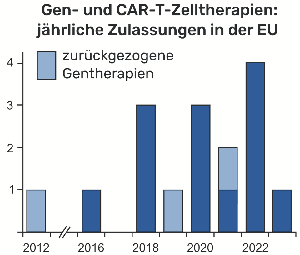 Dreizehn Gentherapien sind aktuell in der Europäischen Union zugelassen, drei wurden bereits wieder vom Hersteller zurückgezogen (Abb.: Volker Henn).