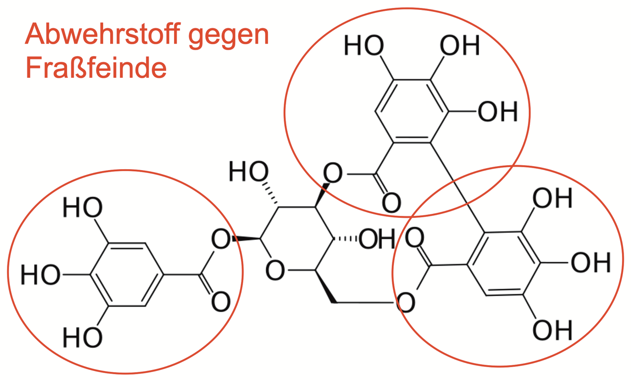 Die Gerbsäure „Corilagin“, ein Vertreter der Ellagi-Tannine, ein „Gallussäure-Trio an der Glucose“.