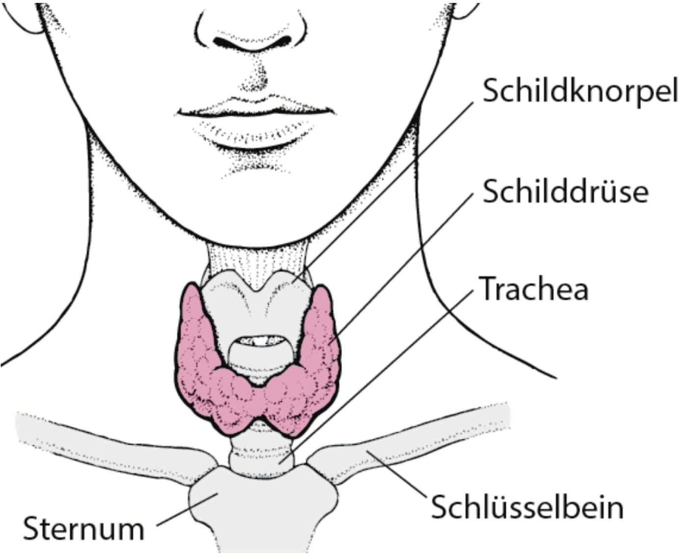 Schilddrüse das Organ, das die Hormone T3 und T4 herstellt und bei zu wenig Iod für Kropf und Kretinismus verantwortlich ist.