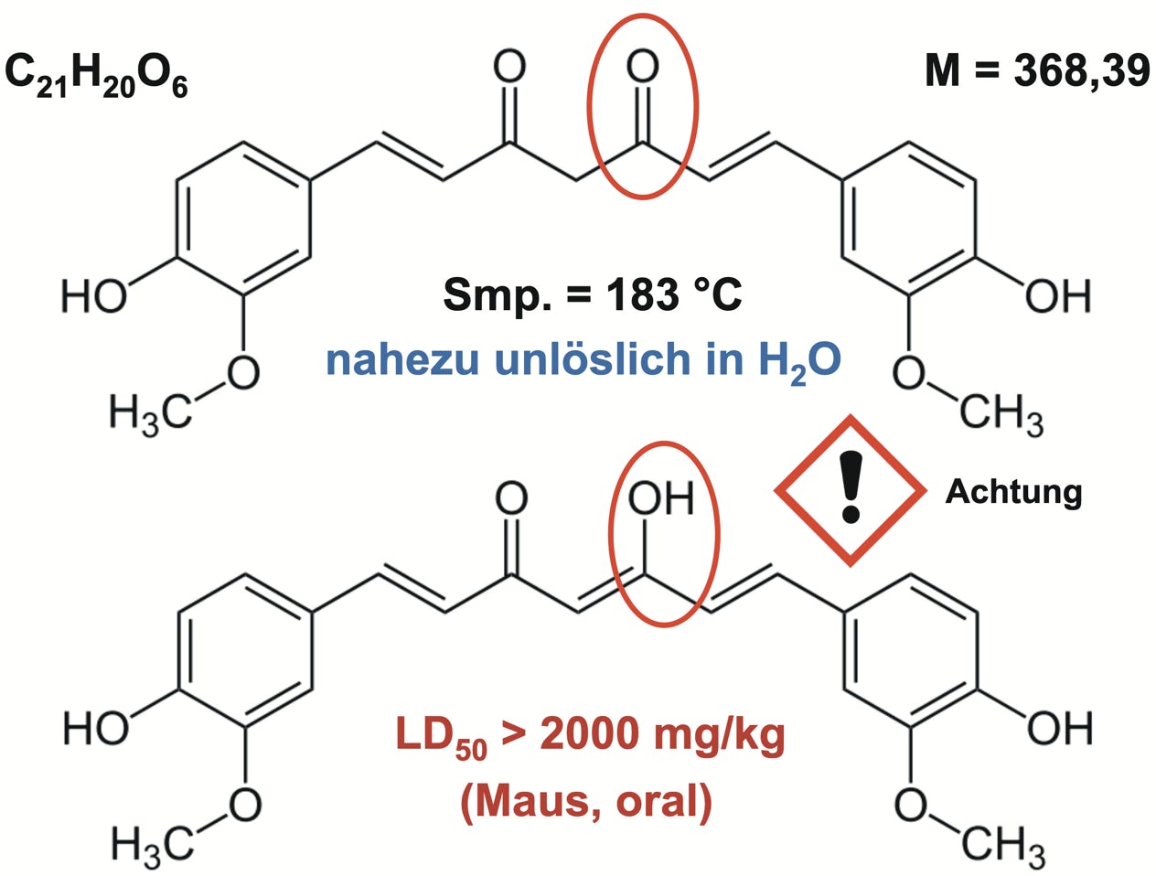 Molekül-Struktur von Curcumin in der Keto-Form (oben) und Enol-Form (ungen) sowie einige Eigenschaften.