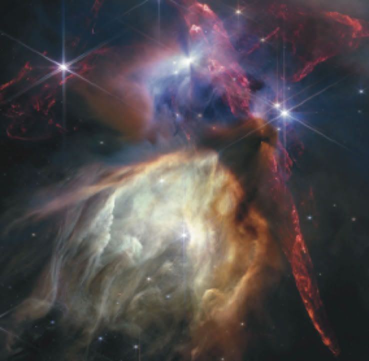 Abbildung 1 (auch das Titelbild dieser CLB-Ausgabe): Die „Ursuppe“, aus der komplexe organische Vorläufermoleküle für biologische Prozesse entstehen, befindet sich nach immer mehr Erkenntnissen bereits im Kosmos. Dieses Bild des James-Webb-Weltraumteleskops zeigt den 390 Lichtjahre entfernten Sternennebel Rho Ophiuchi, in dem junge Sterne gerade ihre Planetensysteme bilden. Jets, die von jungen Sternen ausgehen, treffen auf das umgebende interstellare Gas und regen molekularen Wasserstoff an (in Rot dargestellt). Einige Sterne zeigen den Schatten einer zirkumstellaren Scheibe. In den Gaswolken lassen sich polyzyklische aromatische Kohlenwasserstoffe nachweisen (das heller gefärbte Gas in der unteren Bildmitte). Auch Glykoaldehyde, die Bausteine für eine RNA-Kette bilden können, sowie Methylisocyanat, Baustein für replikationsfähige Moleküle, wurden bereits in interstellaren Wolken nachgewiesen (Abb.: NASA, ESA, CSA, STScI / Pontoppidan, Pagan).