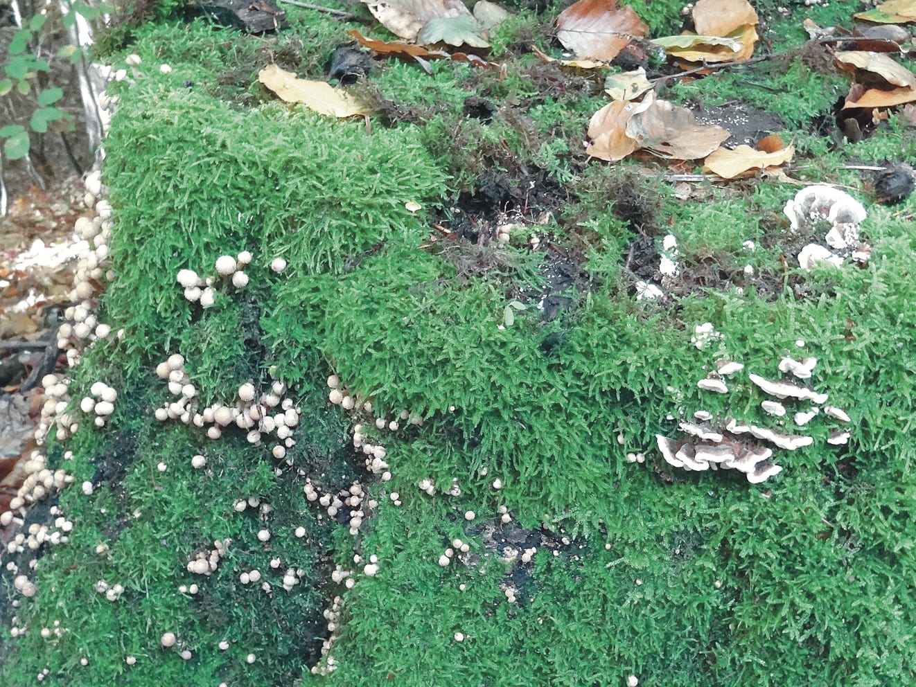 Die Pilze (Fungi) bilden das dritte große Reich eukaryotischer Lebewesen neben den Tieren und den Pflanzen. Sie sind wie die Pflanzen, zu denen sie lange gerechnet wurden, sesshaft, verfügen jedoch nicht über die Fähigkeit zur Photosynthese. Daher müssen sie sich wie Tiere durch die Aufnahme organischer Substanzen ernähren. Diese nehmen sie in gelöster Form aus der Umgebung auf. Nach heutiger Kenntnis sind die Pilze näher mit den Tieren als mit den Pflanzen verwandt. Es gibt unterschiedlichste Formen von Pilzen (Fotobeispiel: Pilze an einem alten Baumstumpf; Foto: Kickuth). Riesige Pilznetzwerke gibt es in der Erde; viele Bäume beziehen in Symbiose mit ihnen Nährstoffe aus dem Boden. Schleimpilze finden erstaunlich effiziente Wege, die an Intelligenz erinnern, für die Nährstoffversorgung.