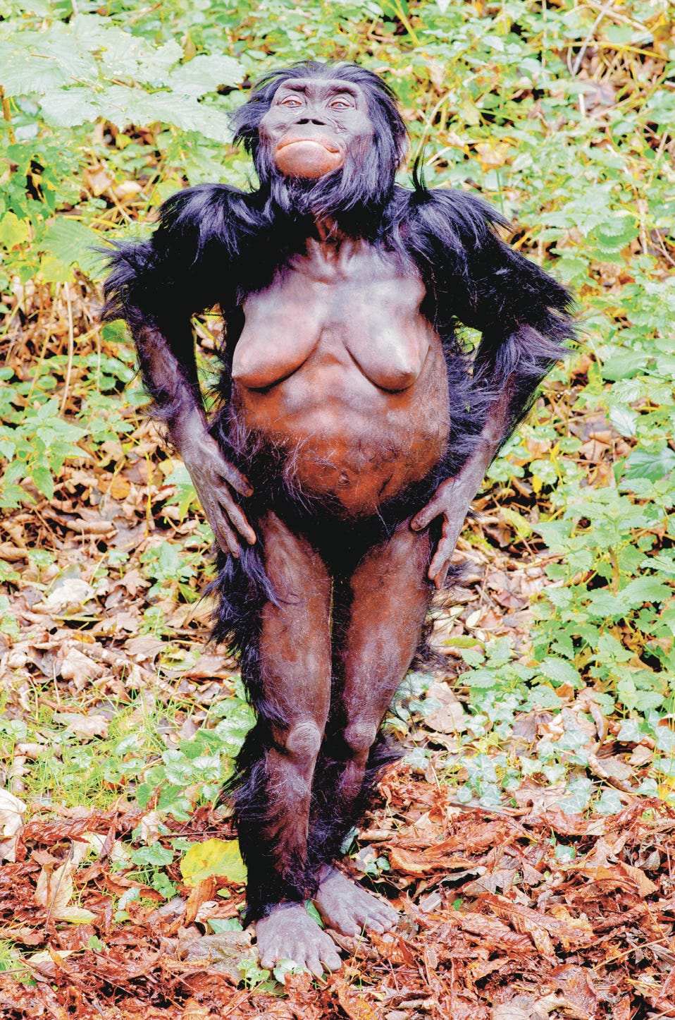 Lebend-Rekonstruktion eines Australopithecus afarensis, genannt Lucy, Fundort Hadar Äthiopien, im Neanderthal-Museum. Lucy war schon relativ Haar-arm, ging aufrecht, hatte aber noch relativ kurze Beine (Abb.: Wikipedia / Neanderthal-Museum Mettmann CC BY-SA 4.0).