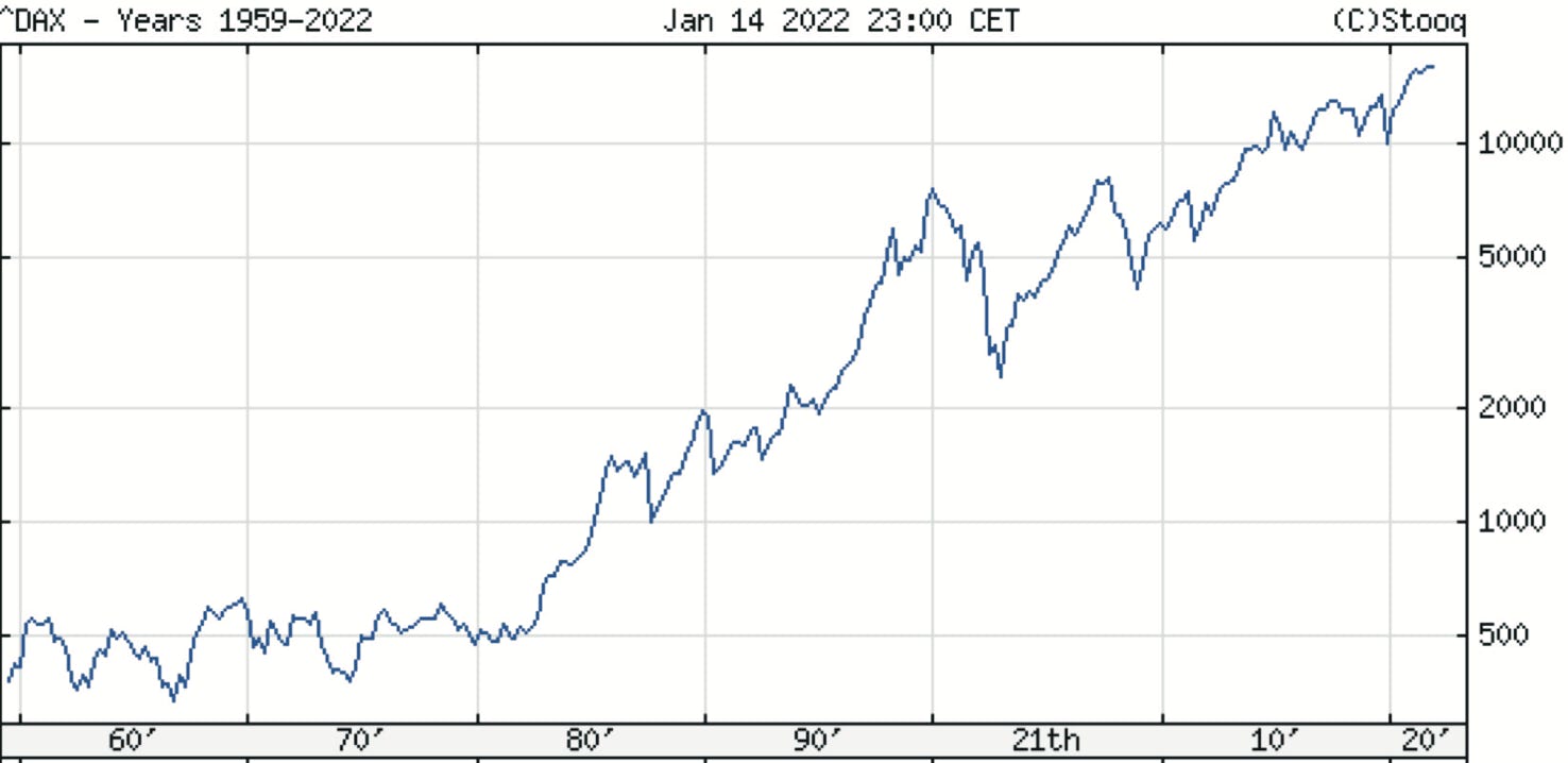 Die Entwicklung des Deutschen Aktienindex DAX bzw. seiner Vornotierungen aus Index der Börsen-Zeitung, dessen Geschichte bis ins Jahr 1959 zurückgeht. Unten die Zeiträume, bezeichnet mit den Jahrzehnten, rechts der Wert. Man beachte, dass die rechte Skala logarithmisch ist. Der Wertzuwachs sieht hier eher linear aus, nähert sich real aber dem Exponentiellen (Abb.: htt- ps://stooq.com/q/?s=^dax, abgefragt am 14.1.2022).