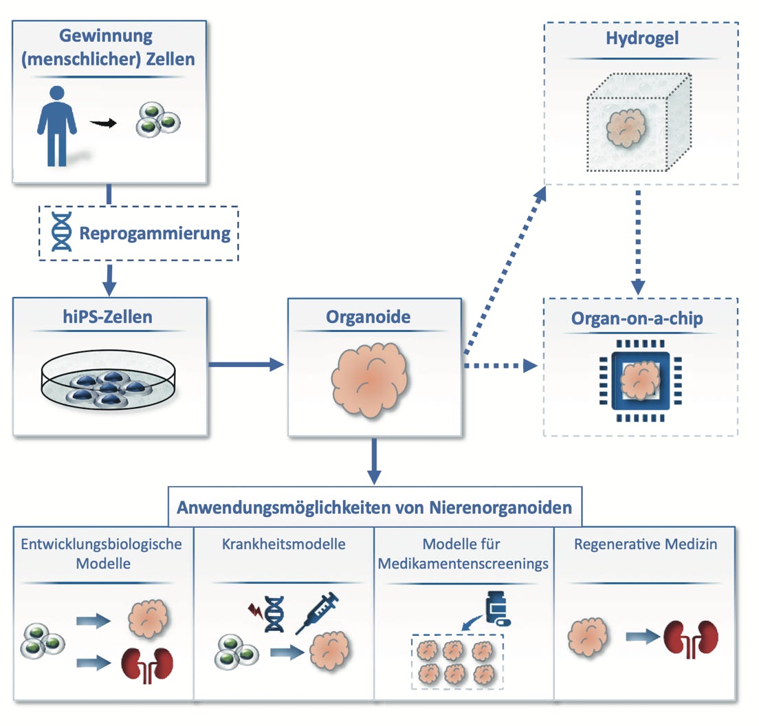 Zur Anwendung von Nierenorganoiden. Humane induzierte pluripotente Stammzellen (hiPS-Zellen) können von PatientAbbildung und Patienten gewonnen werden, um (patientenspezifische) Nierenorganoide herzustellen. Dabei können auch genetische Modifikationen eingeführt werden, um die Organoide als Krankheitsmodelle oder zur Erprobung genetischer Therapien einsetzen zu können. Die erhaltenen Nierenorganoide können in Hydrogelen und/oder Organ-on-a-Chip-Systemen verwendet werden, um eine größere Ähnlichkeit mit der Situation in vivo herzustellen. Als Entwicklungsmodelle können sie dazu genutzt werden, um neue Erkenntnisse zur Nierenentwicklung zu generieren und Nierenmodelle zu verbessern. Organoide Krankheitsmodelle können entweder durch genetische Veränderung oder durch Kontakt mit krankheitsauslösenden Stoffen hergestellt und zur Entwicklung neuer Therapien eingesetzt werden. Nierenorganoide bieten auch eine wertvolle Plattform zur Durchführung von Medikamentenscreenings und Toxizitätstests in großem Maßstab. Schließlich können sie auch zum Ziel der Wiederherstellung einer funktionierenden Niere in der regenerativen Medizin beitragen (Quelle: Forschungsbericht „Organoide“ der interdisziplinären Arbeitsgruppen der Berlin-Brandenburgischen Akademie der Wissenschaften, Kapitel 3.6: 3-D-Nierenorganoide für die Translation neuen Wissens vom Labor in die Klinik).