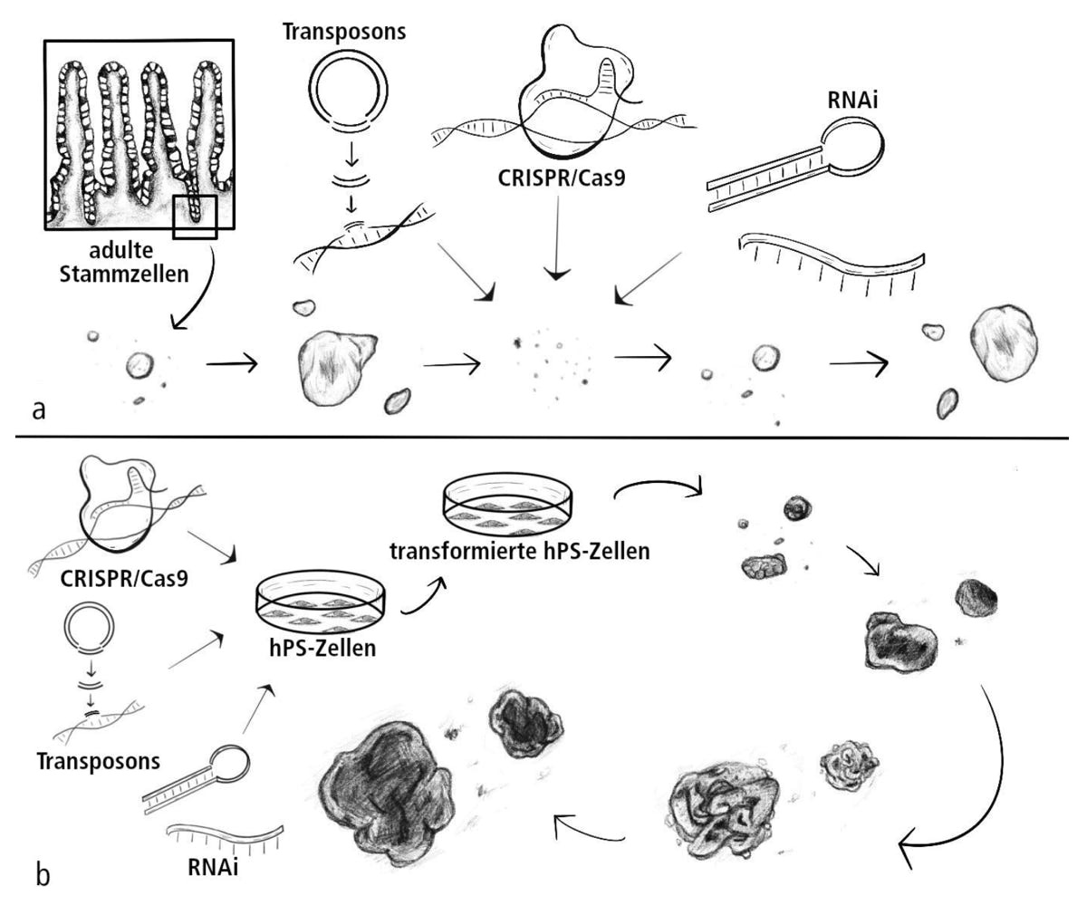 a) Um aus adulten Stammzellen gewonnene Organoide zu erzeugen, werden im Gewebe vorkommende Stammzellen isoliert und als Organoide kultiviert, damit sie sich unter In-vitro-Bedingungen stabilisieren können. Zur genetischen Modifikation werden die Organoide in einzelne Zellen aufgespalten, bevor das gewählte genetische Werkzeug eingeführt wird. Modifizierte Einzelzellen bilden im Anschluss wieder Organoide, die in Kultur gehalten oder zur Langzeitlagerung eingefroren werden können.
