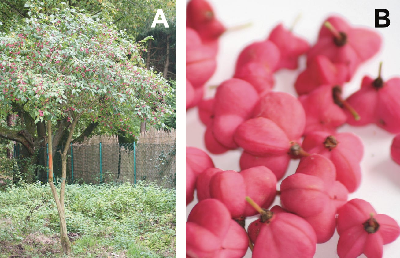 Pfaffenhut-Baum (A) und seine giftigen Früchte (B; Fotos: Wolfgang Hasenpusch).