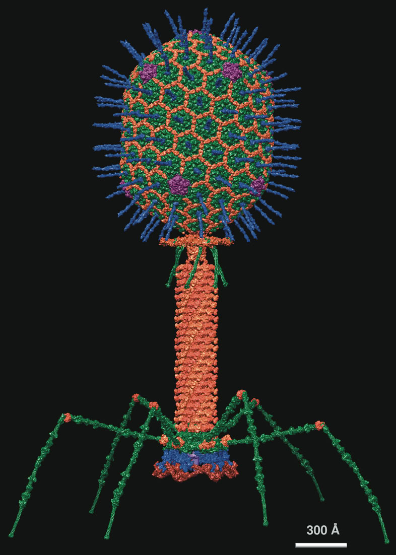 Noch bis September 2027 läuft das DFG-Programm “New Concepts in Prokaryotic Virus-host Interactions – From Single Cells to Microbial Communities” (SPP 2330), eine Plattform für die ‘Phage Biology Community’. Unterstützt werden derzeit 21 Projekte. Das Bild zeigt ein Strukturmodell de Bakteriophagen T4 in atomarer Auflösung, erstellt mit dem Programm UCSF Chimera aus einzelnen PDB- und Kryo-EM-Dateien. Die Struktur ist maßstabsgetreu (Abb.: Wiki / Dr. Victor Padilla-Sanchez CC BY-SA 4.0; siehe dazu auch das Titelbild dieser CLB).