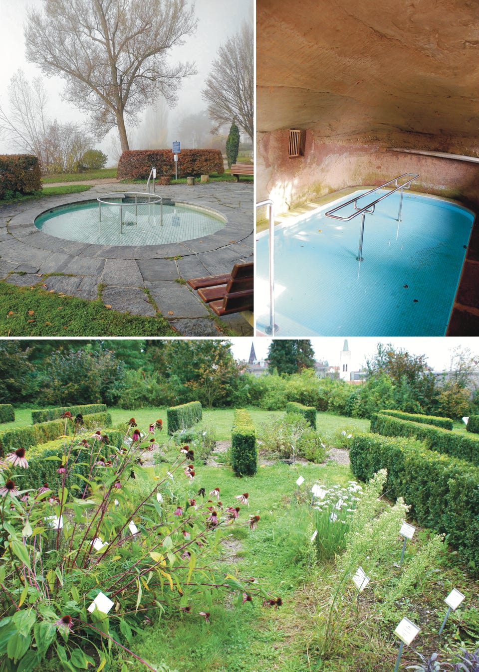 Sebastian Kneipp ist insbesondere durch seine Wasserkuren bekannt. In Überlingen am Bodensee gibt es gleich vier Kneipp-Anlagen; hier zu sehen eine am Seeufer (oben links, Wikipedia Baekem CCBYSA) sowie diejenige in einer Grotte im Stadtgarten (Wikipedia Gerhard Giebener CCBY). Kneipps Interesse an Pflanzen zeigt sich dann in einem Kräutergarten an der Sebastian-Kneipp-Steige in dem Bodenseeort (Wikipedia Frank Vincentz CCBYSA).