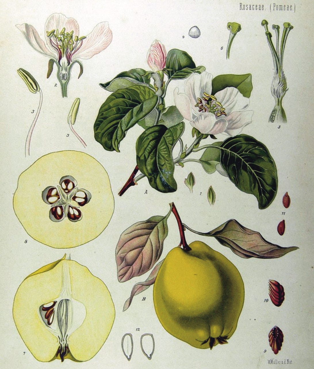 Detail-Grafiken zur Quitte von Franz Eugen Köhler (1863-1914): „Köhler's Medizinal-Pflanzen“, Gera.