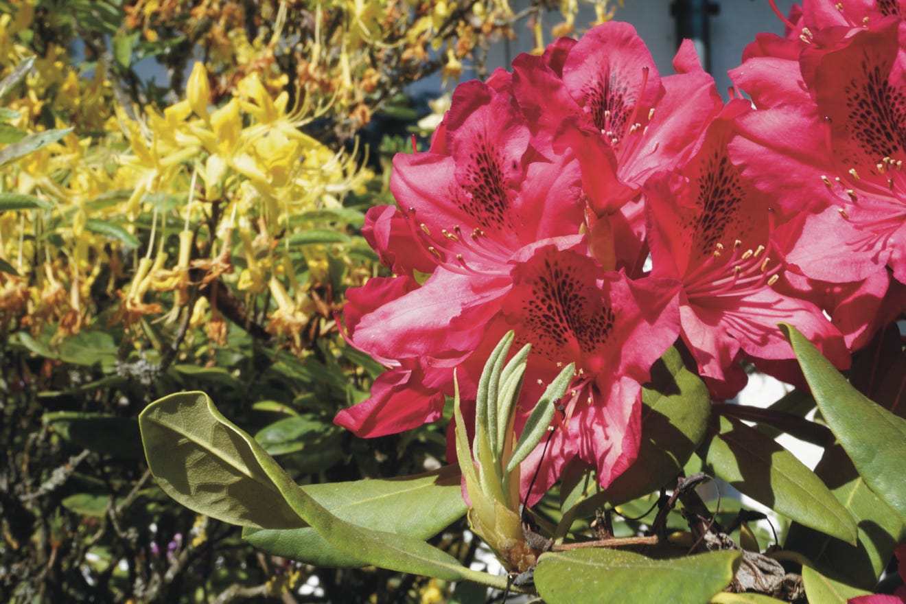 Detailaufnahme einer Rhododendren-Zierbepflanzung. Rechts im Vordergrund: Rhododendron Hymenanthes; links (leicht unscharf): Rhododendron lutheum, die gelbe Azalee (siehe dazu auch das Titelbild; Foto: Rolf Kickuth).