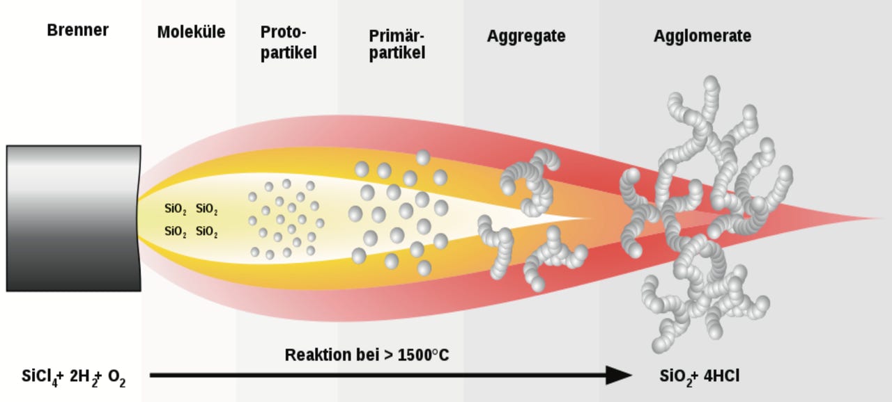 Schematische Darstellung zur Herstellung pyrogener Kieselsäure (Grafik: Wikipedia / MagentaGreen CC BY-SA 3.0).