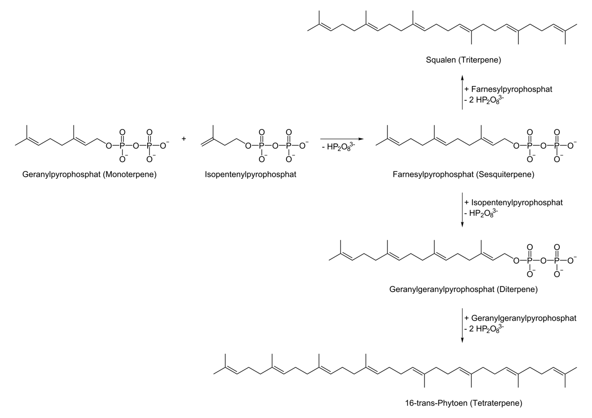 Ein zentraler Baustein in der Biosynthese von Terpenen ist das Dimethylallylpyrophosphat (DMAPP) und sein Doppelbindungsisomer Isopentenylpyrophosphat (IPP). Beide Bausteine enthalten fünf Kohlenstoff-Atome und eine Doppelbindung und können als aktiviertes Isopren aufgefasst werden. Die Farnesylpyrophosphatsynthase verknüpft ein Molekül DMAPP und zwei Moleküle IPP zum Farnesylpyrophosphat (FPP), das das Grundgerüst der cytosolischen Sesquiterpene ist. Aus zwei Einheiten Farnesylphosphat entsteht das Squalen (Squalensynthase), das Grundgerüst der Triterpene. Die plastidäre Geranylgeranylpyrophosphatsynthase verknüpft ein Molekül DMAPP mit drei Molekülen IPP zum Geranylgeranylpyrophosphat (GGPP), dem Grundgerüst der Diterpene. GGPP kann wiederum zum 16-trans-Phytoen reagieren, dem Grundgerüst der Tetraterpene.