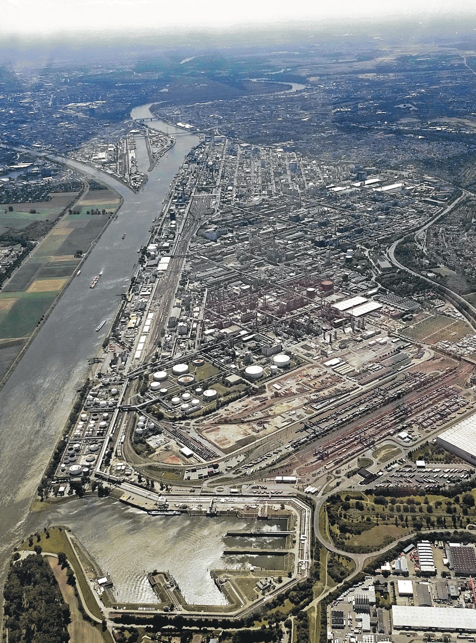 Blick auf ein Chemieunternehmen: die BASF in Ludwigshafen am Rhein von Nord nach Süd (Foto: Kickuth).