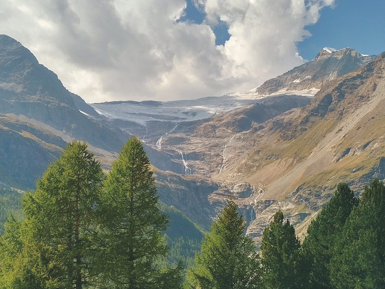 Abbildung 1: Wasser als unsichtbare, gasförmige Luftfeuchtigkeit mit blauem Himmel, als schwebende Tröpfchen in weißen Wolken, als fließendes Wasser in weißen Bächen und als festes Eis in weißen Gletschern (Blick von der Alp Grüm Richtung Piz d’Arlas, Bild: Peter Bützer 2023).
